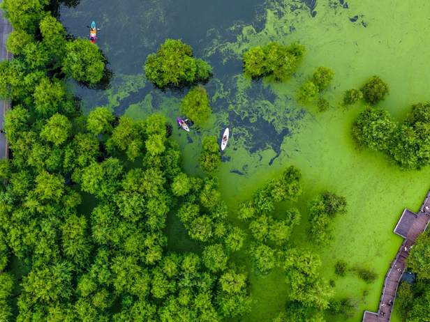 夏日的杭州市临安区青山湖,俯瞰仿佛抹茶森林