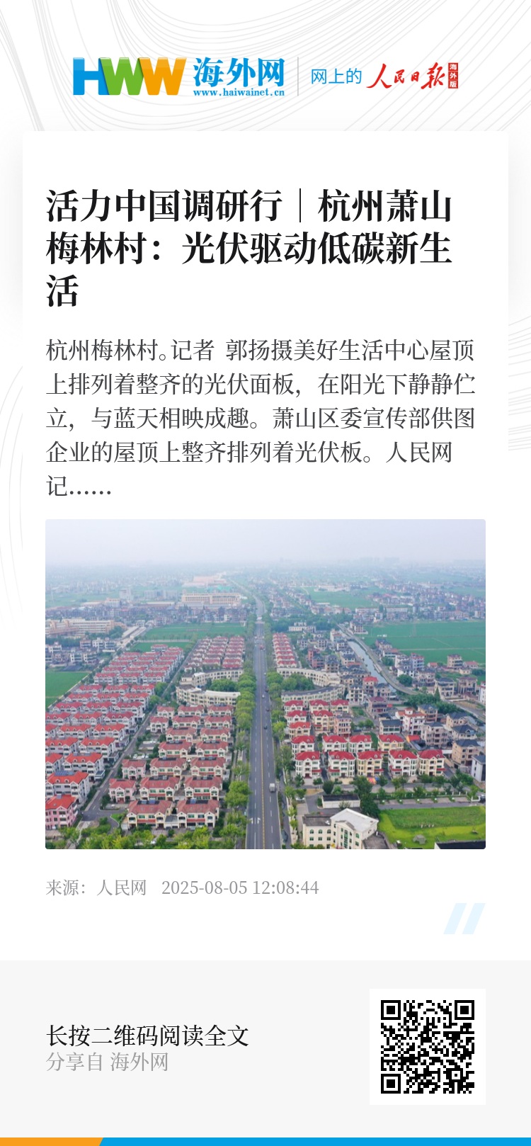 人民网杭州8月5日电(记者刘军国、郭扬)8月初,走进杭州萧山区梅林村,美好生活中心屋顶上排列着整齐的光伏面板,在阳光下静静伫立,与蓝天相映成趣。