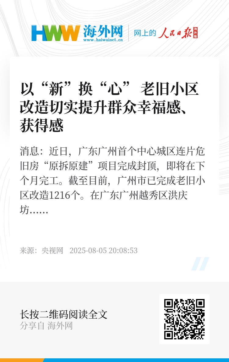 央视网消息:近日,广东广州首个中心城区连片危旧房“原拆原建”项目完成封顶,即将在下个月完工。截至目前,广州市已完成老旧小区改造1216个。