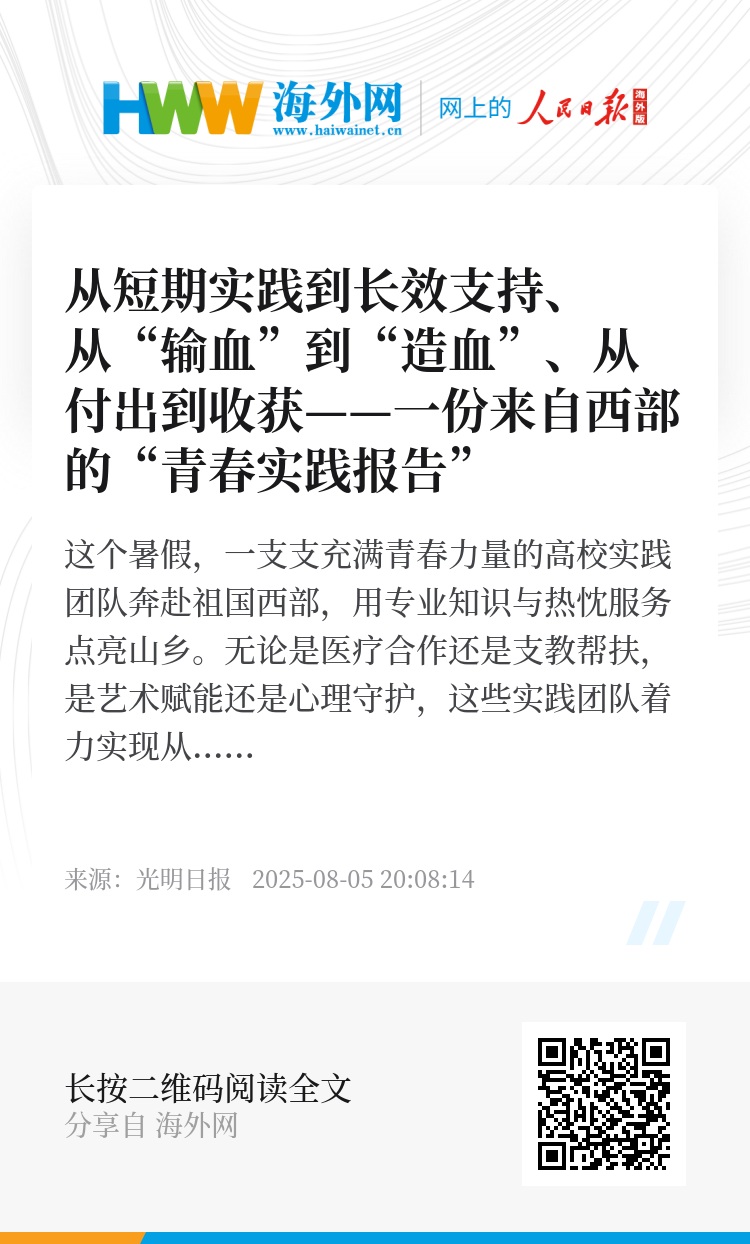 这个暑假,一支支充满青春力量的高校实践团队奔赴祖国西部,用专业知识与热忱服务点亮山乡。无论是医疗合作还是支教帮扶,是艺术赋能还是心理守护,这些实践团队着力实现从短期实践到长效支持、从“输血”到“造血”的转变,助力当地旧貌换新颜。在广袤的西部大地上,他们读懂国情民情,厚植家国情怀,用实际行动诠释新时代青年的责任与担当。