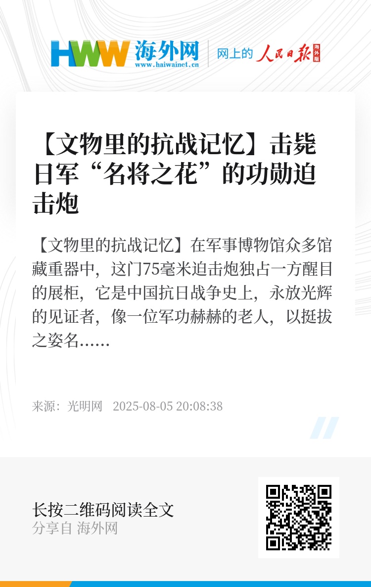 在军事博物馆众多馆藏重器中,这门75毫米迫击炮独占一方醒目的展柜,它是中国抗日战争史上,永放光辉的见证者,像一位军功赫赫的老人,以挺拔之姿名炳青史。