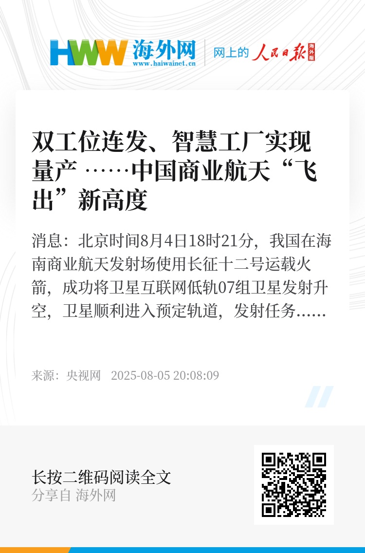 此次发射的卫星互联网低轨07组卫星是由银河航天研制的。这是我国商业航天企业首次批量研制该类卫星,并承担国家重大发射任务。