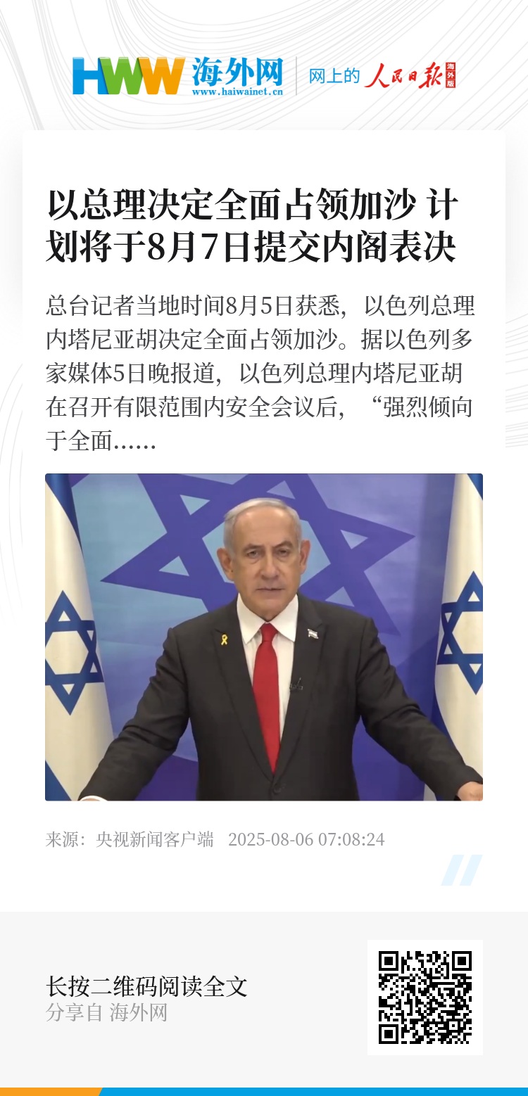 总台记者当地时间8月5日获悉,以色列总理内塔尼亚胡决定全面占领加沙。