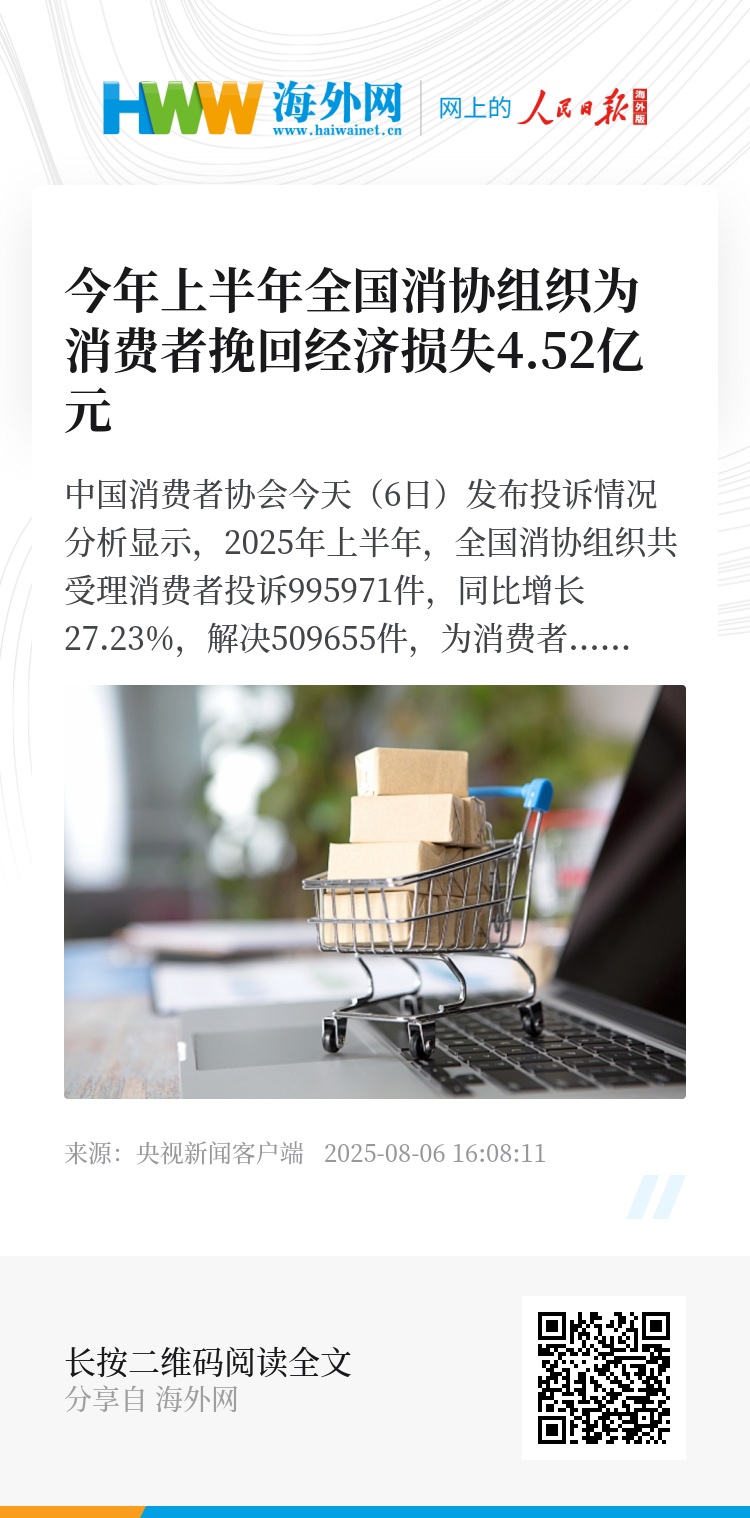 中国消费者协会今天(6日)发布投诉情况分析显示,2025年上半年,全国消协组织共受理消费者投诉995971件,同比增长27.23%,解决509655件,为消费者挽回经济损失4.52亿元。在所有投诉中: