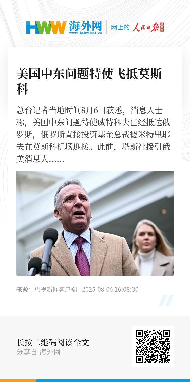 总台记者当地时间8月6日获悉,消息人士称,美国中东问题特使威特科夫已经抵达俄罗斯,俄罗斯直接投资基金总裁德米特里耶夫在莫斯科机场迎接。