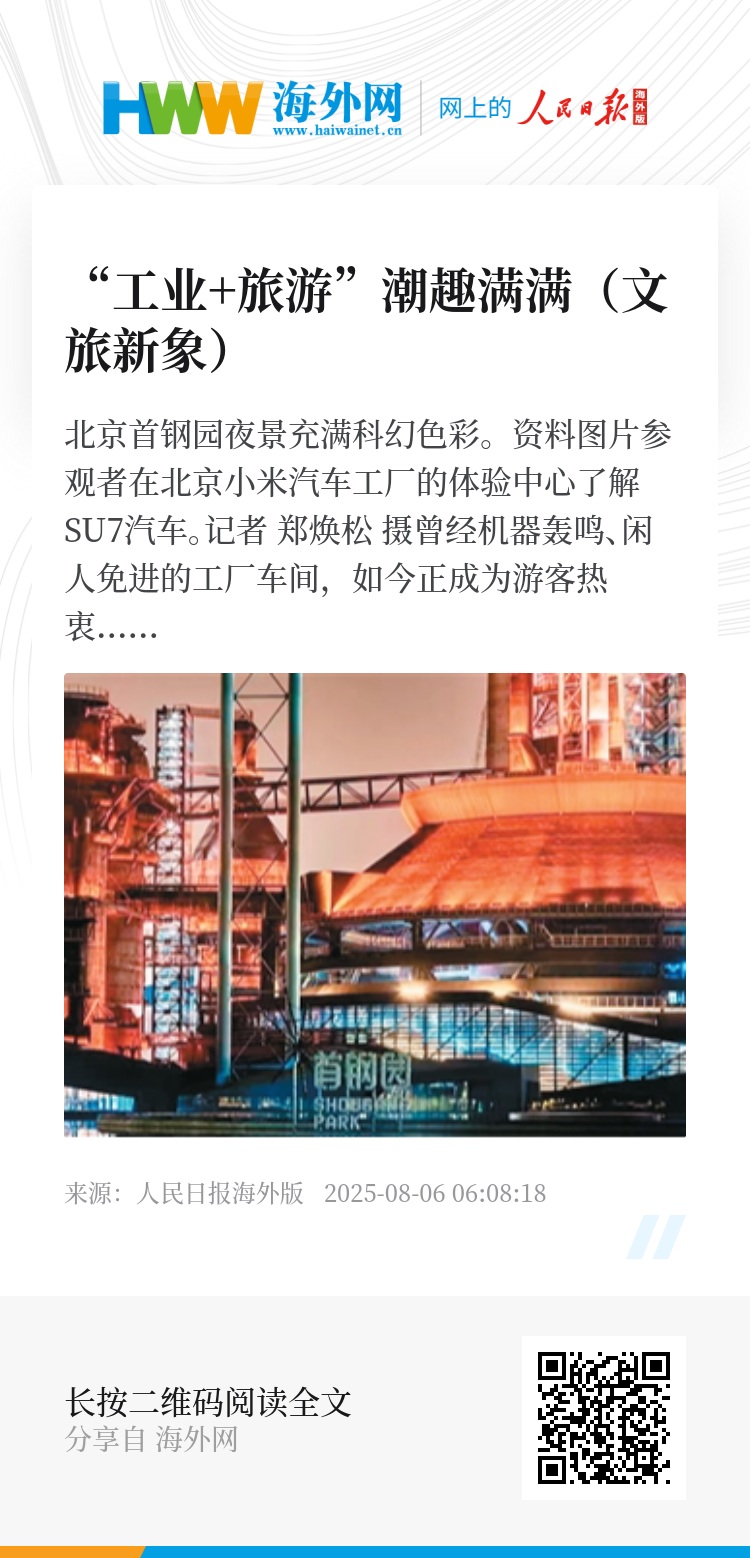 曾经机器轰鸣、闲人免进的工厂车间,如今正成为游客热衷探访的目的地。从承载厚重历史的工业遗产,到“科技范儿”十足的现代化流水线,再到寓教于乐的研学课堂,“到工厂去旅游”逐渐成为备受欢迎的旅游新风潮,呈现出跨界融合的“新风景”。
