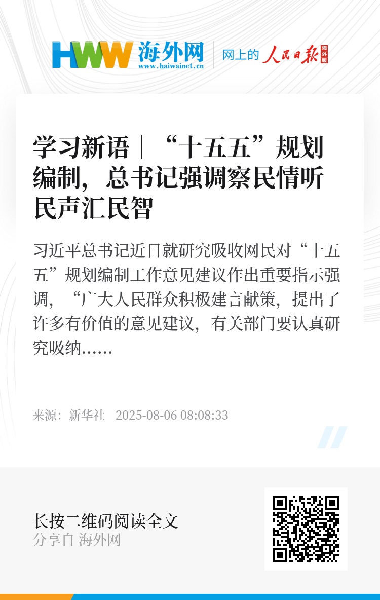 今年5月20日至6月20日,“十五五”规划编制工作开展网络征求意见活动,累计收到网民建言超过311.3万条,为编制“十五五”规划提供了有益参考。