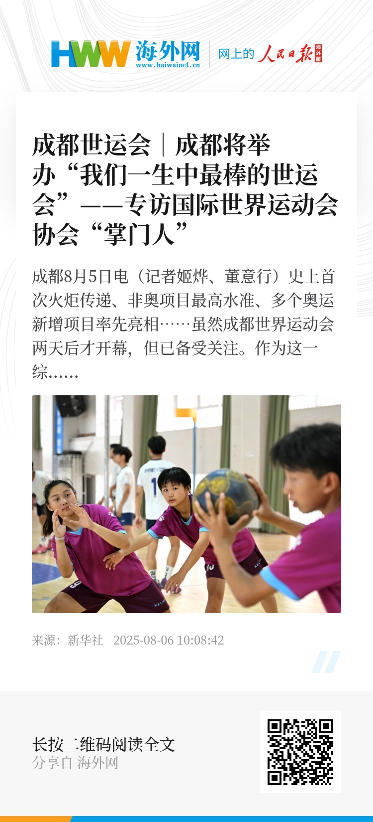 新华社成都8月5日电(记者姬烨、董意行)史上首次火炬传递、非奥项目最高水准、多个奥运新增项目率先亮相……虽然成都世界运动会两天后才开幕,但已备受关注。作为这一综合性运动会的国际组织负责人,国际世界运动会协会(IWGA)主席何塞·佩鲁雷纳和首席执行官阿希姆·高索纷纷点赞成都,认为成都将为世界呈现“最棒的世运会”。