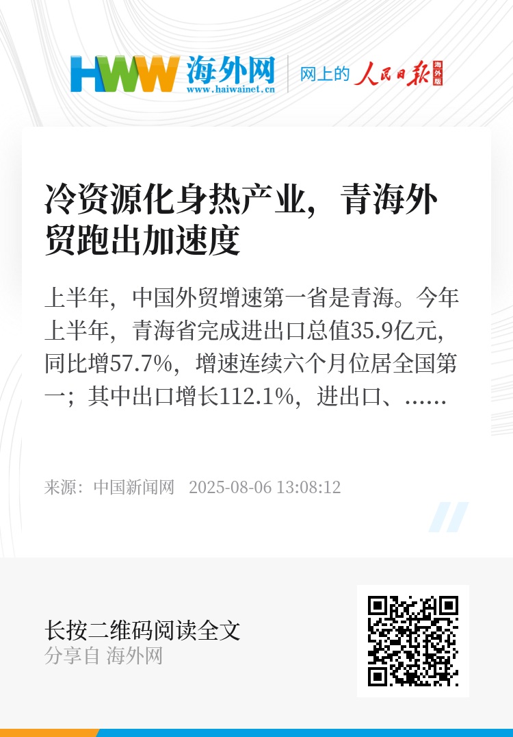 今年上半年,青海省完成进出口总值35.9亿元,同比增57.7%,增速连续六个月位居全国第一;其中出口增长112.1%,进出口、出口增速双双领跑全国。