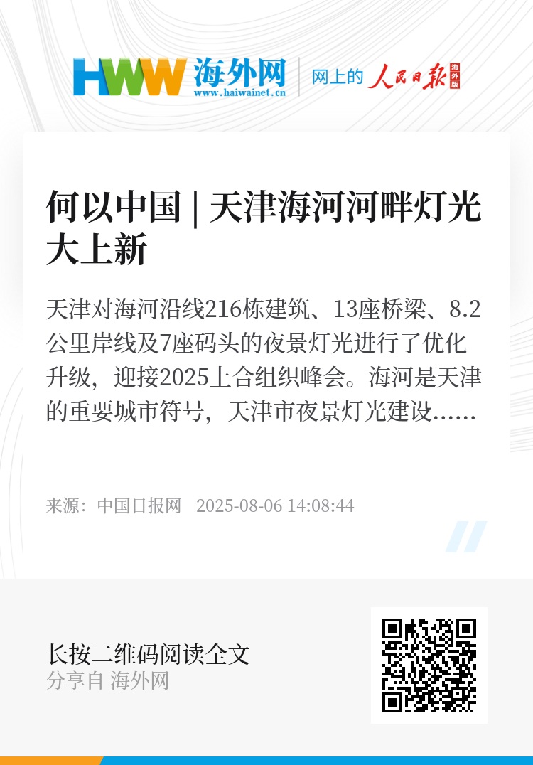 天津对海河沿线216栋建筑、13座桥梁、8.2公里岸线及7座码头的夜景灯光进行了优化升级,迎接2025上合组织峰会。