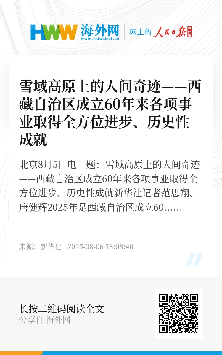 新华社北京8月5日电 题:雪域高原上的人间奇迹——西藏自治区成立60年来各项事业取得全方位进步、历史性成就