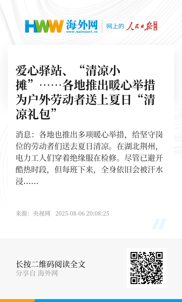 央视网消息:各地也推出多项暖心举措,给坚守岗位的劳动者们送去夏日清凉。