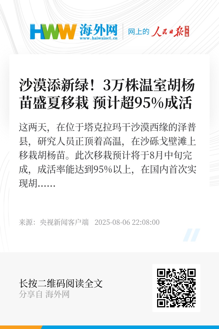 这两天,在位于塔克拉玛干沙漠西缘的泽普县,研究人员正顶着高温,在沙砾戈壁滩上移栽胡杨苗。此次移栽预计将于8月中旬完成,成活率能达到95%以上,在国内首次实现胡杨全生长季的育苗移栽。此次移栽的3万株胡杨苗全部在温室大棚中培育完成,育苗周期仅为4个月。