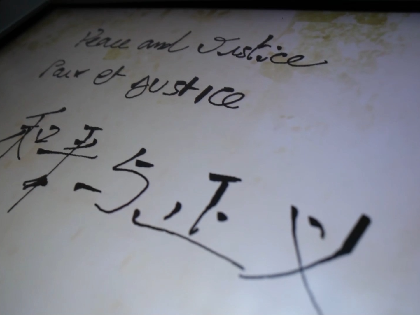 参观完毕后,马库斯和士杰、钟灏松一起用中文、英文、法文在留言板上写下了“和平与正义”。