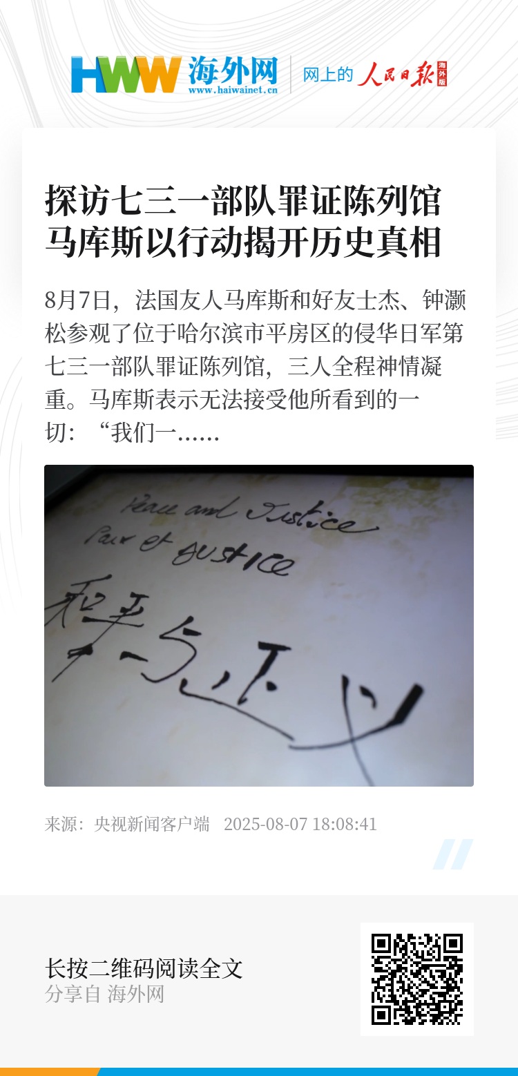8月7日,法国友人马库斯和好友士杰、钟灏松参观了位于哈尔滨市平房区的侵华日军第七三一部队罪证陈列馆,三人全程神情凝重。