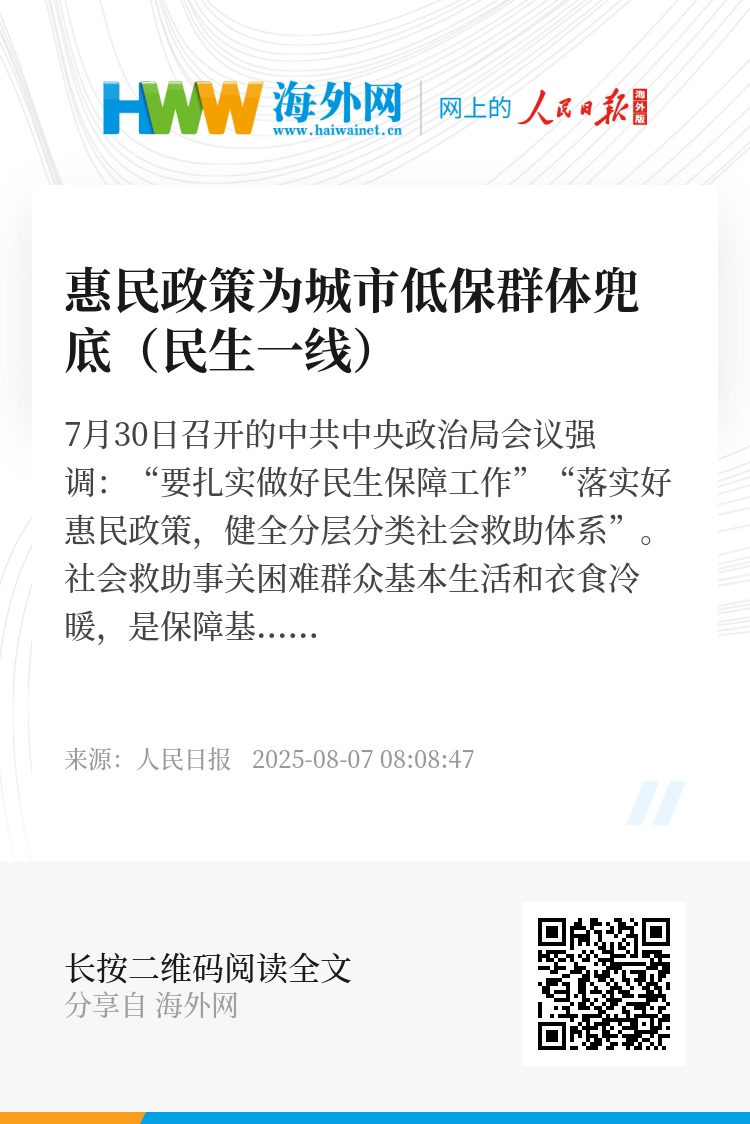 7月30日召开的中共中央政治局会议强调:“要扎实做好民生保障工作”“落实好惠民政策,健全分层分类社会救助体系”。