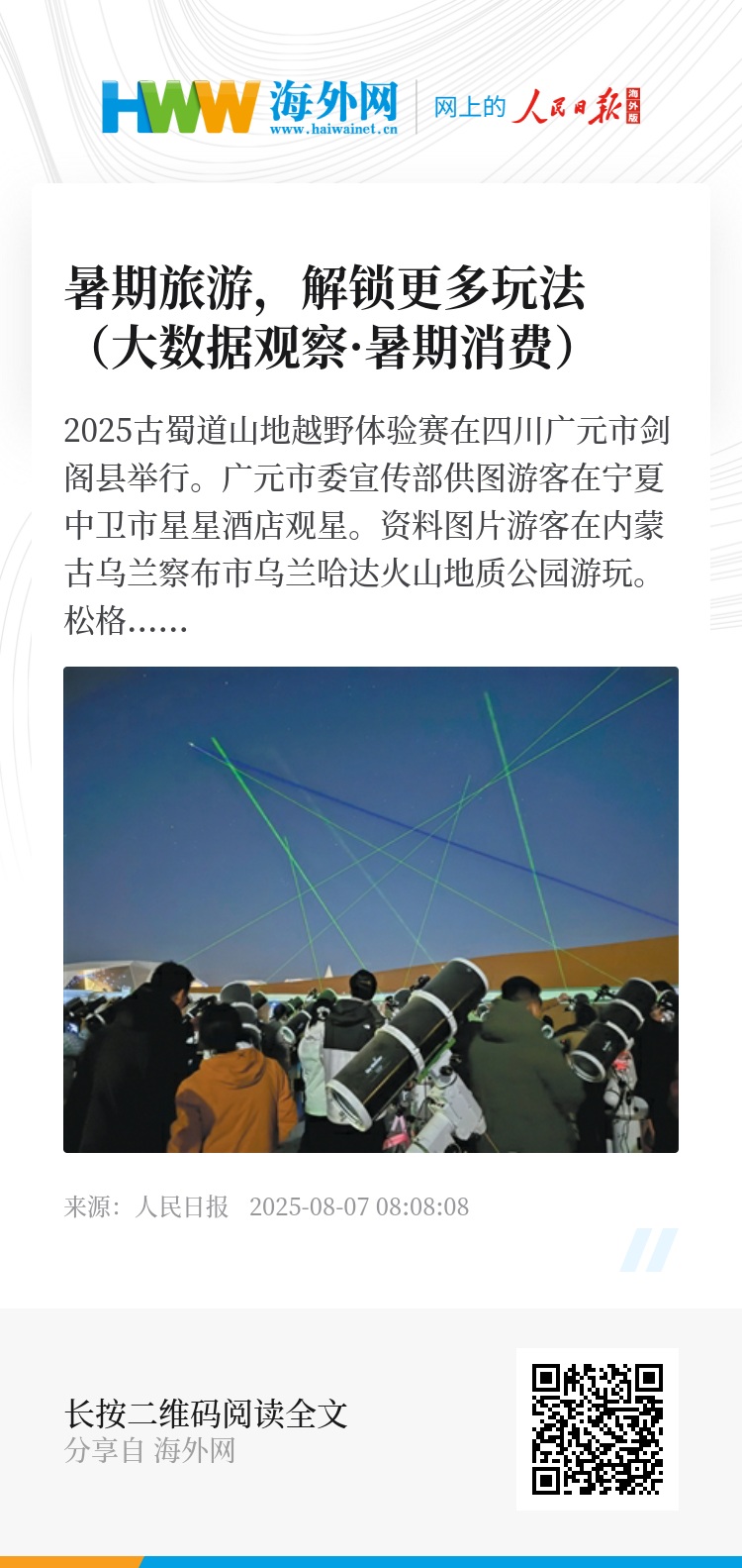 古道徒步,在放松身心的同时感触历史文脉;大漠观星,沉浸于远离都市喧嚣的自然静谧;草原露营,体会天苍苍野茫茫的旷达惬意……许多人将脚步迈得更远,在尝试旅游新玩法的同时,也为暑期消费注入新活力。