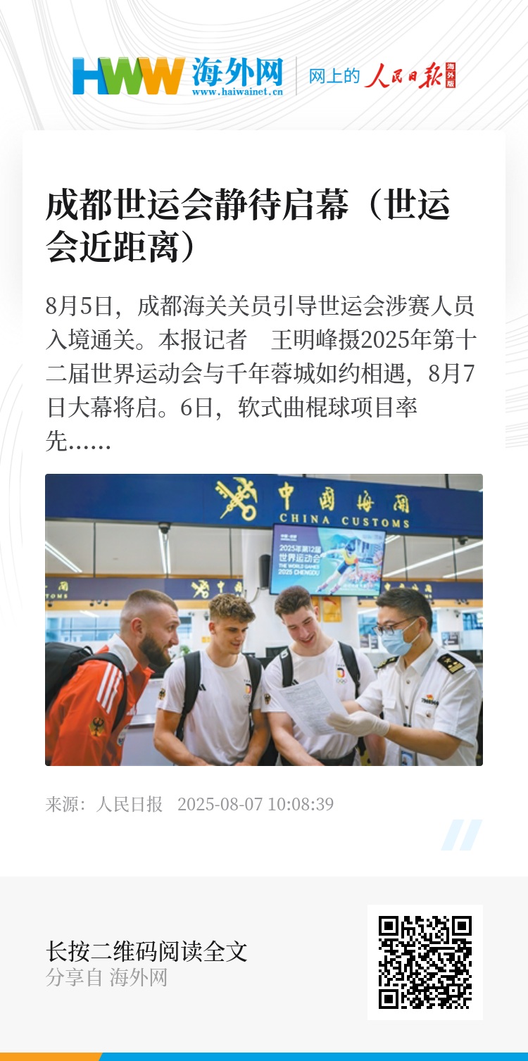 “世运会期间正值暑运高峰,成都天府国际机场出入境人数较平常增加了1.5倍,我们优化了智能检查通道,保障旅客快捷通关;还开设了世运会专用窗口,为涉赛人员提供通关、咨询等‘一站式’服务。”成都海关相关负责人薛珂说。据了解,8月3日至18日是成都世运会官方抵离服务期,预计将有超过5000名涉赛人员从成都天府国际机场等口岸通关。