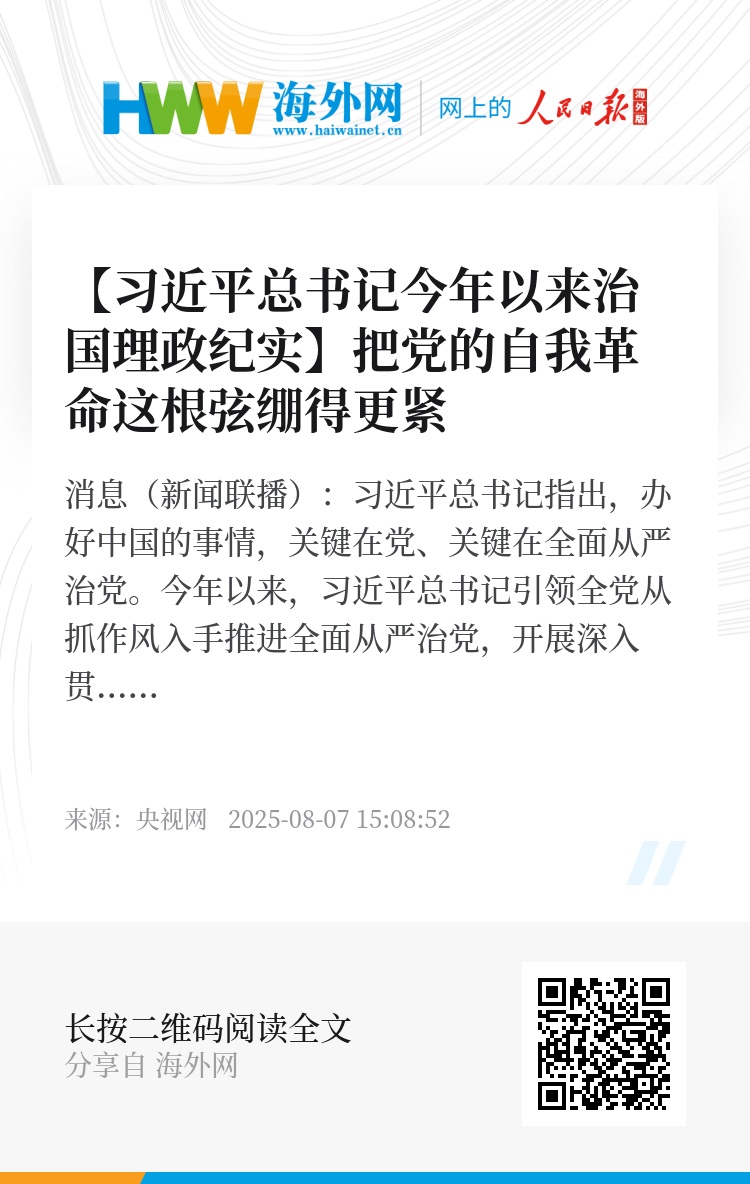 央视网消息(新闻联播):习近平总书记指出,办好中国的事情,关键在党、关键在全面从严治党。今年以来,习近平总书记引领全党从抓作风入手推进全面从严治党,开展深入贯彻中央八项规定精神学习教育,坚持用改革精神和严的标准管党治党,持之以恒推进党的自我革命,为推进中国式现代化提供坚强保障。系列报道《习近平总书记今年以来治国理政纪实》今天(8月6日)播出《把党的自我革命这根弦绷得更紧》。