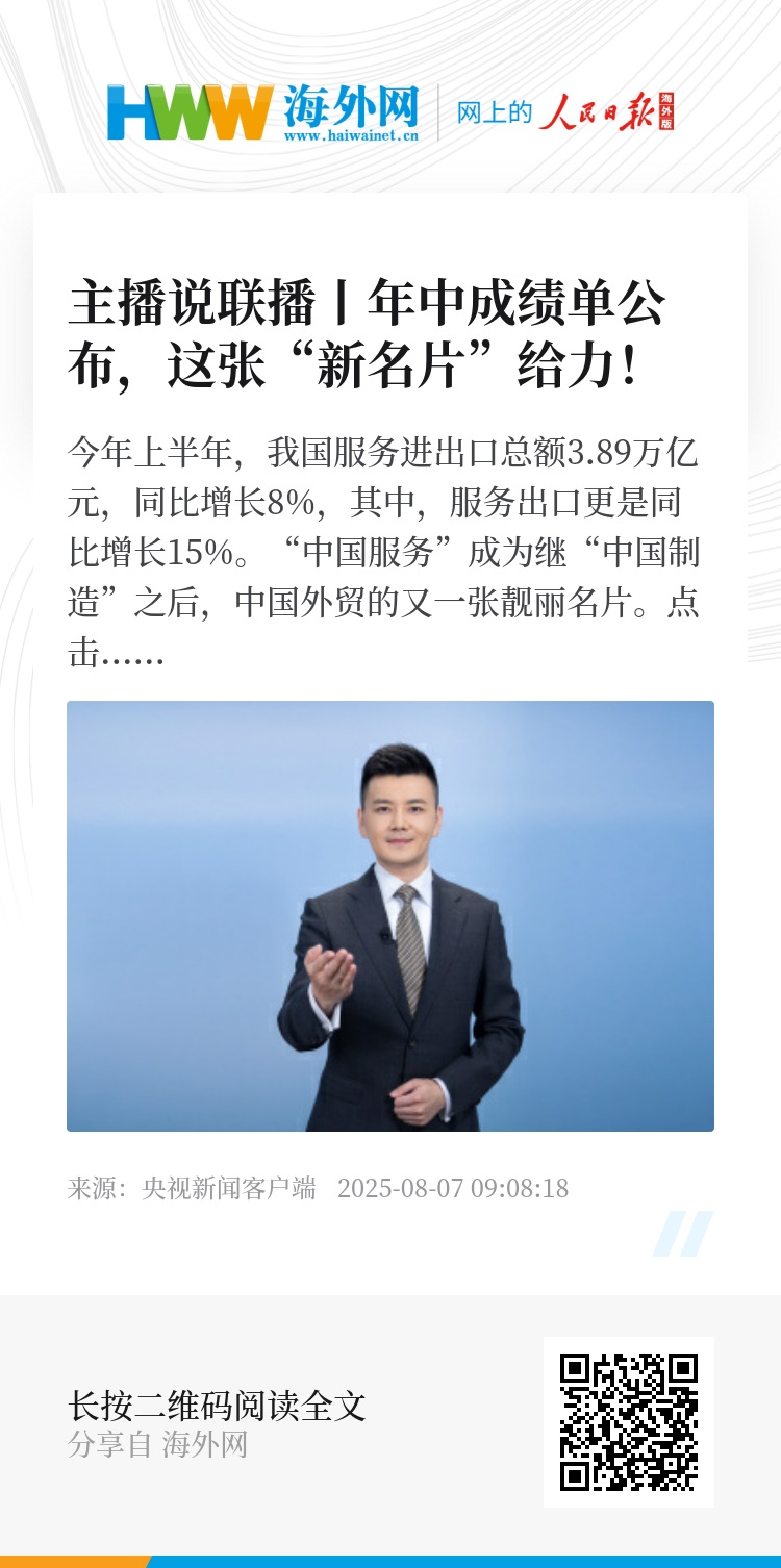 大家知道,我国货物贸易规模稳居全球第一,其实,我国服务贸易规模同样稳居全球第二。创新提升服务贸易,是重要的外贸增长点。此次,服务贸易交出亮眼的年中“成绩单”,彰显实力也激发信心,中国外贸,定会稳健前行。