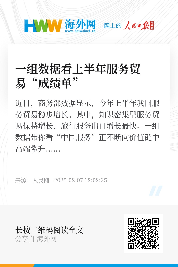 近日,商务部数据显示,今年上半年我国服务贸易稳步增长。其中,知识密集型服务贸易保持增长、旅行服务出口增长最快。一组数据带你看“中国服务”正不断向价值链中高端攀升。