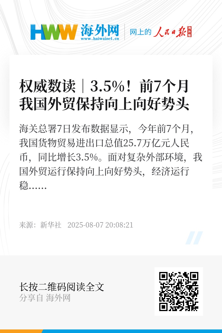 海关总署7日发布数据显示,今年前7个月,我国货物贸易进出口总值25.7万亿元人民币,同比增长3.5%。面对复杂外部环境,我国外贸运行保持向上向好势头,经济运行稳中有进。