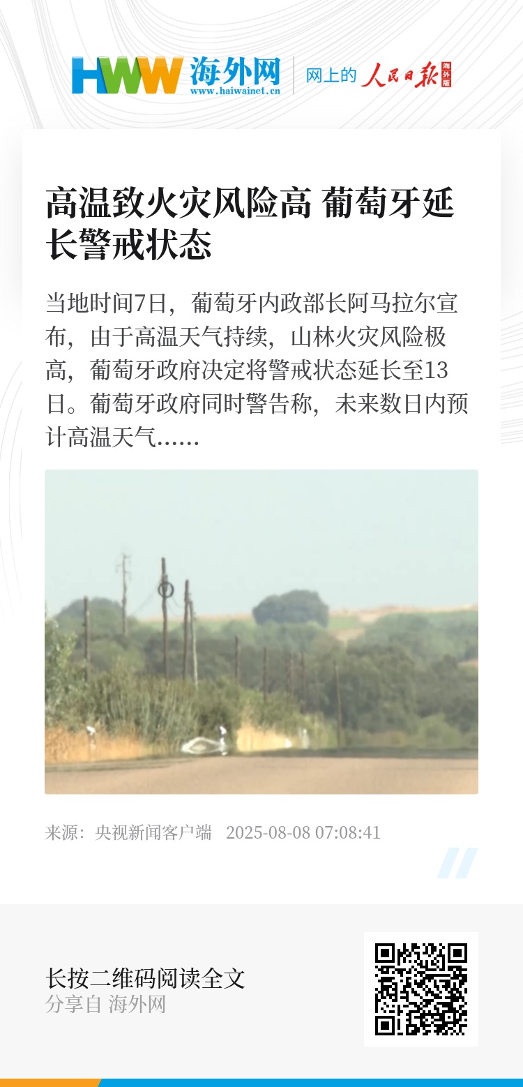 由于极为严重的高温天气加剧了一些地区的山火风险,葡萄牙自8月3日0时起进入警戒状态,原计划持续至7日。(总台记者 魏帆)