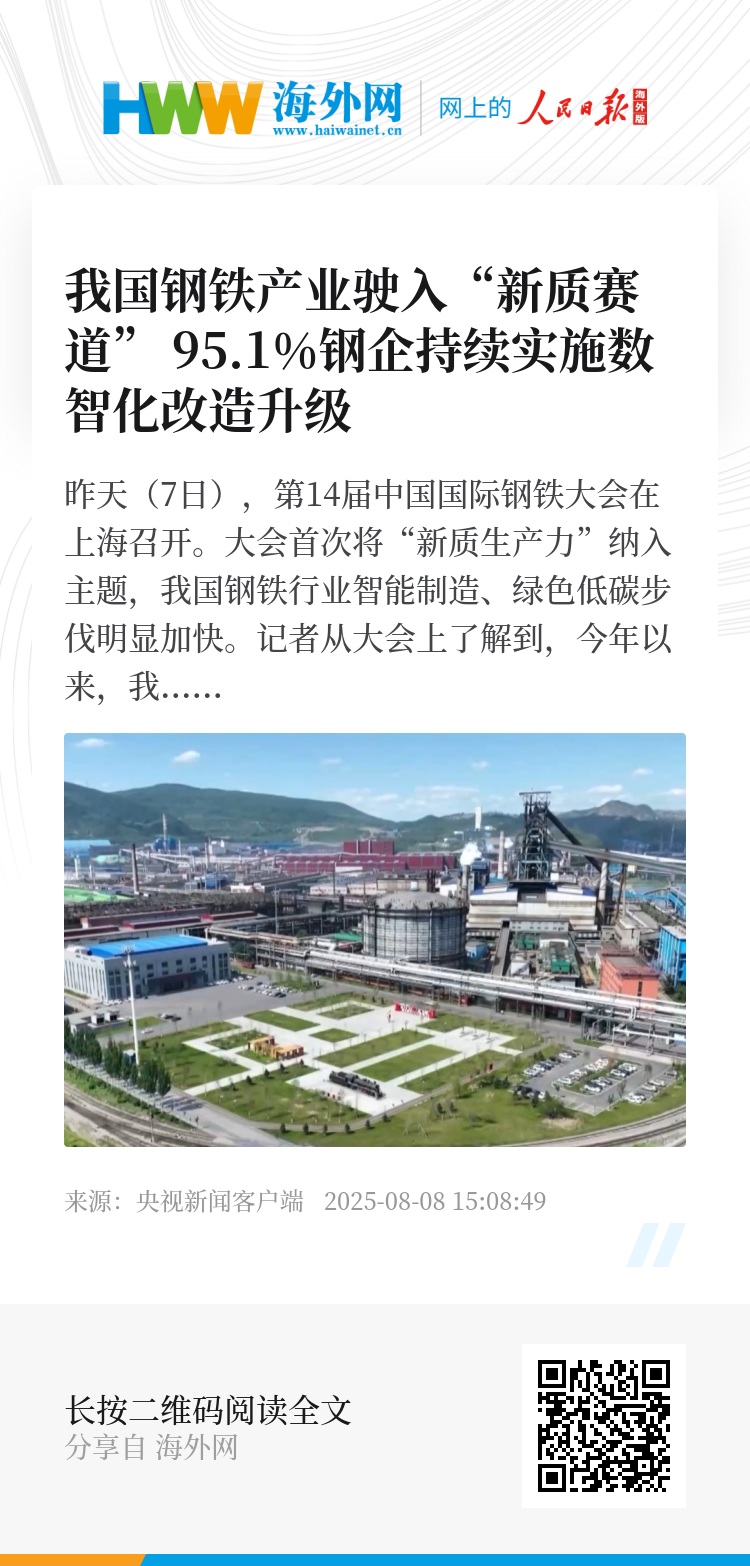 记者从大会上了解到,今年以来,我国钢铁企业加快技术迭代,实现生产效率、能源利用水平和产品质量的全面提升。目前,我国95.1%的钢铁企业将数字化转型战略纳入企业总体发展进程,持续实施数智化改造升级: