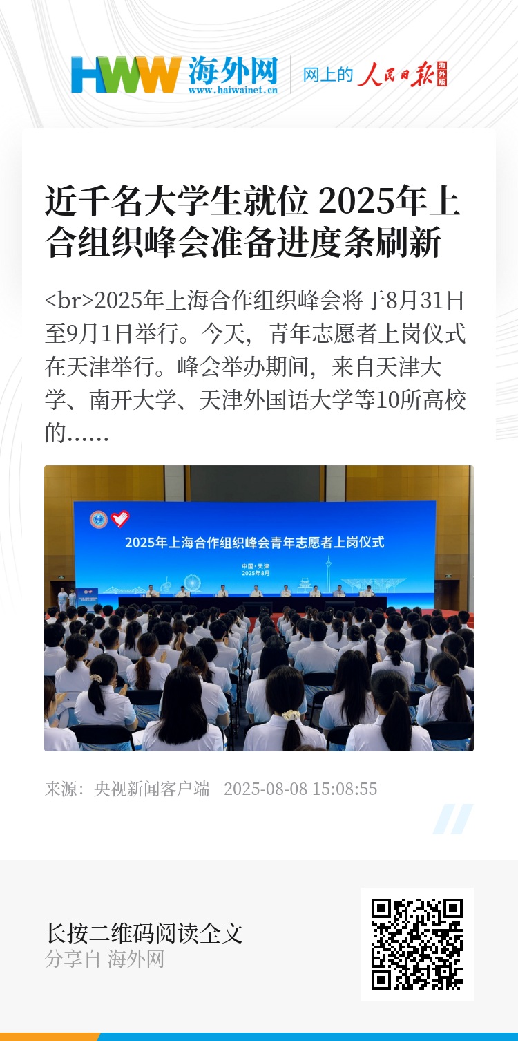 2025年上海合作组织峰会将于8月31日至9月1日举行。今天,青年志愿者上岗仪式在天津举行。