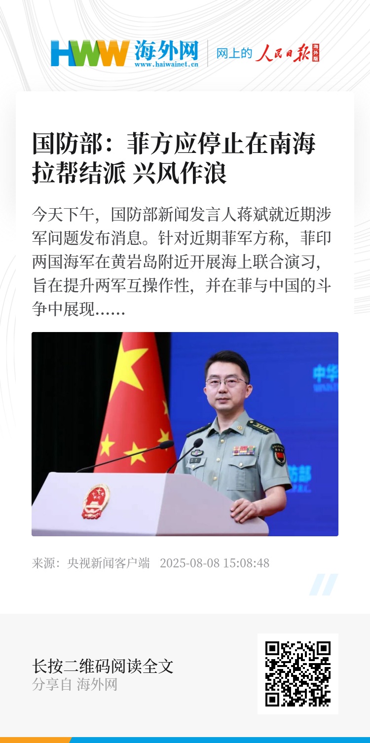 国防部新闻发言人 蒋斌:我们一贯反对以南海问题为借口挑动对抗,一贯主张有关国家军事合作不应针对第三方,不应危害地区和平稳定。菲方四处逢迎,拉拢贴靠域外势力虚张声势,妄图搅乱地区局势趁机渔利,完全背离地区国家求和平、谋发展、促稳定的共同愿望。我们要求菲方停止挑衅炒作,停止在南海拉帮结派、兴风作浪,回到通过对话协商管控分歧的正确轨道上来。