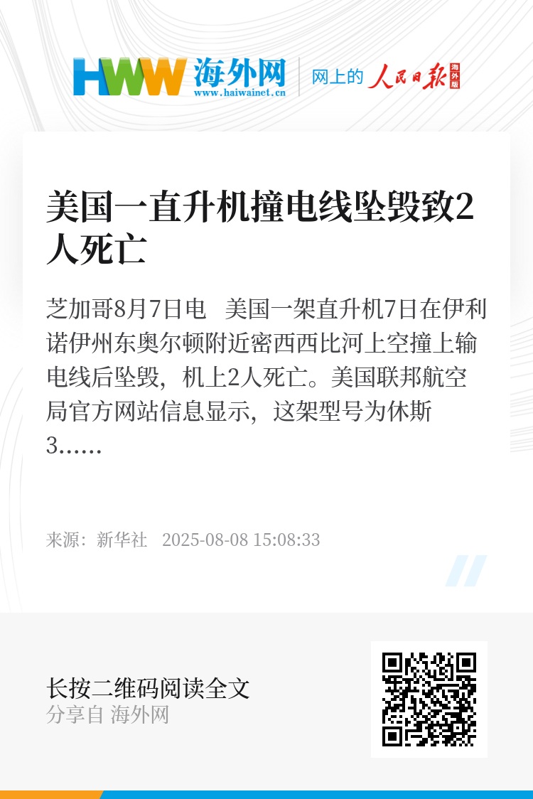 新华社芝加哥8月7日电 美国一架直升机7日在伊利诺伊州东奥尔顿附近密西西比河上空撞上输电线后坠毁,机上2人死亡。