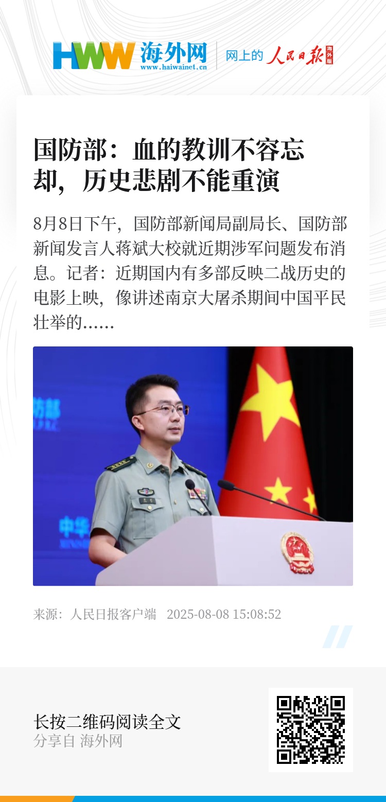 血的教训不容忘却,历史悲剧不能重演。今年是中国人民抗日战争暨世界反法西斯战争胜利80周年。中国军队将传承和弘扬伟大抗战精神,以更强大的能力,更可靠的手段捍卫国家主权、安全、发展利益。