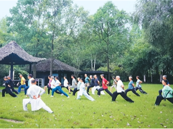 外国游客在四川省青城山学习青城太极拳。