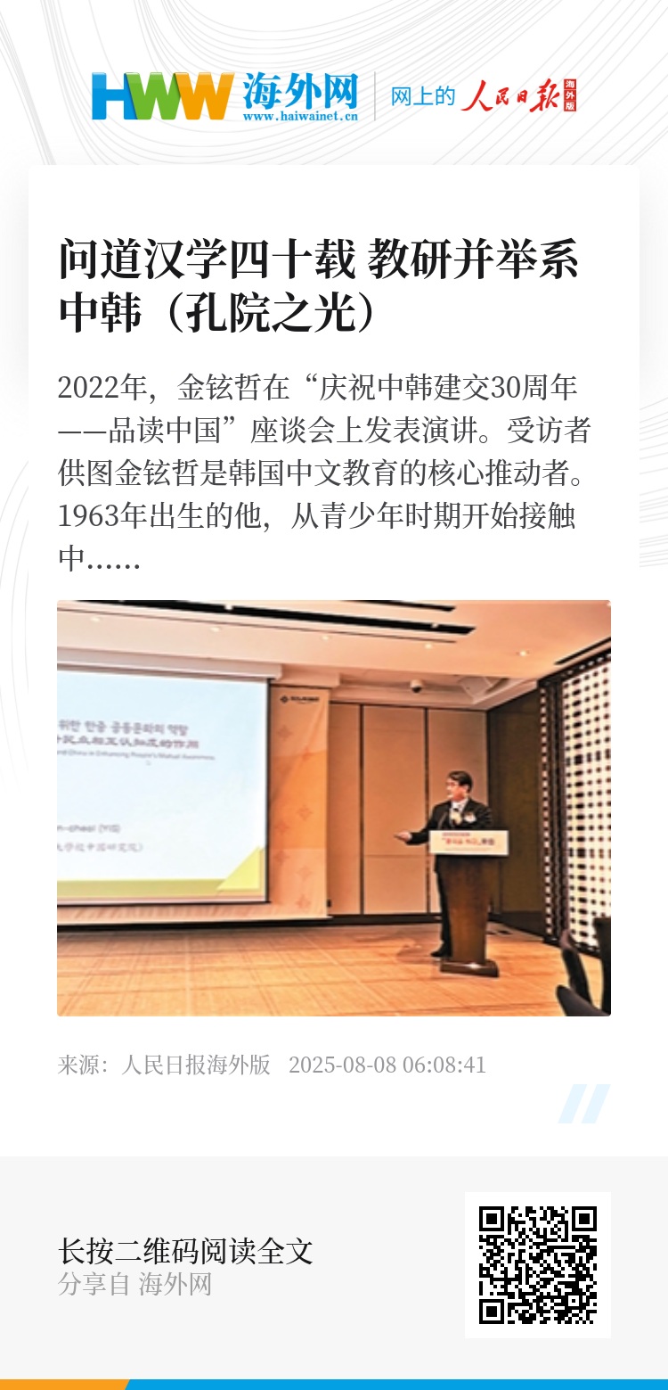 金铉哲:韩国目前稳健运营着24所孔子学院。自2004年全球第一家孔子学院在首尔揭牌成立以来,韩国没有一所关闭过。