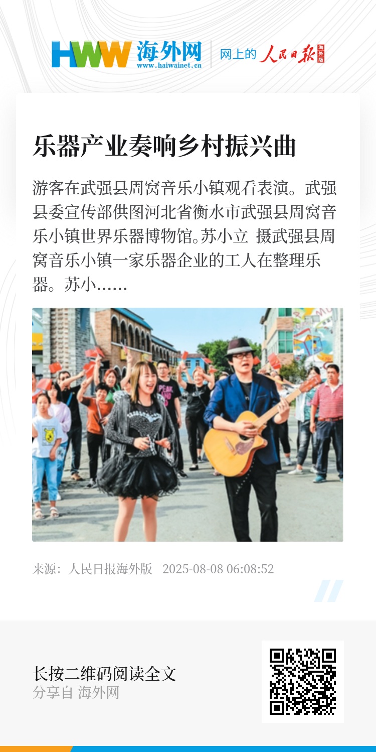 从轰鸣的厂房流水线,到游人如织的文旅小镇,再到广场庭院流淌的即兴乐章……音乐在武强完成了从产业到生活方式的深刻蜕变,它重塑了村庄的面貌,丰盈了百姓的口袋,更滋养出乐观和美、昂扬向上的精气神。(记者 张腾扬)