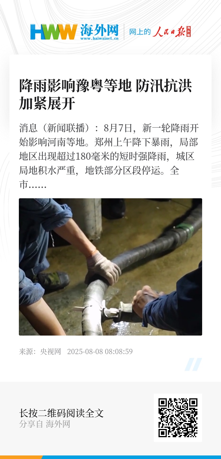 央视网消息(新闻联播):8月7日,新一轮降雨开始影响河南等地。郑州上午降下暴雨,局部地区出现超过180毫米的短时强降雨,城区局地积水严重,地铁部分区段停运。全市采取停产、停业、停运等管控措施。相关部门加紧抽排水作业,并加大对道路、桥梁、隧道及其附属设施的安全巡查力度。