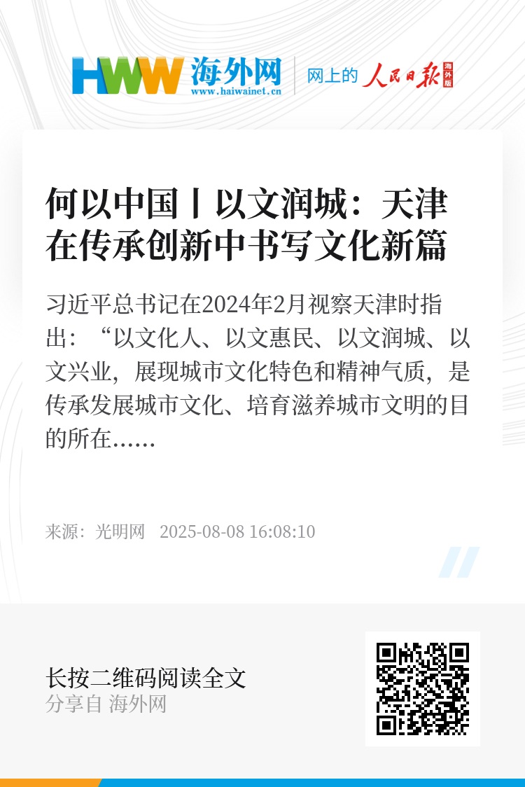 历史文化是城市的“根”与“魂”,更是发展的源泉和动力。天津丰富的文化实践说明了,传承不是守旧,创新不是离根,唯有让历史文化在守护中薪火相传,在创新中与时俱进,城市才能兼具“历史的厚度”与“发展的温度”,在时代发展中始终保持独特的气质与活力。(郝悦)