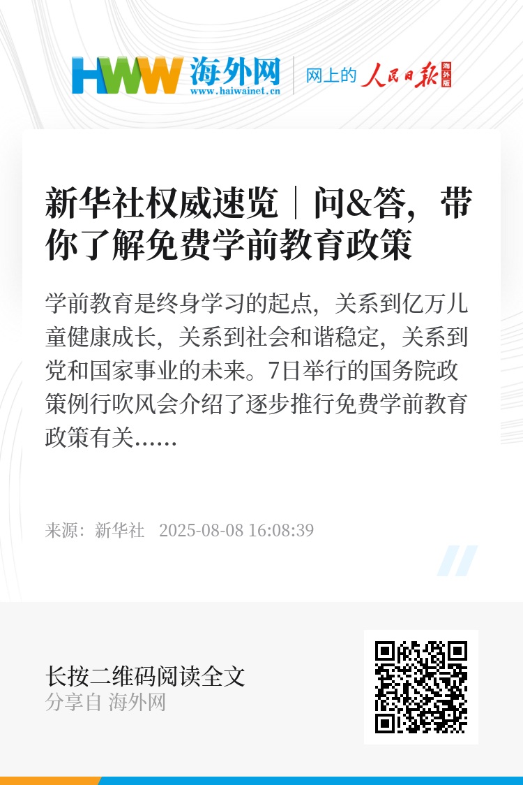 学前教育是终身学习的起点,关系到亿万儿童健康成长,关系到社会和谐稳定,关系到党和国家事业的未来。7日举行的国务院政策例行吹风会介绍了逐步推行免费学前教育政策有关情况,并答记者问。跟随这一组“问&答”,一起来了解下。
