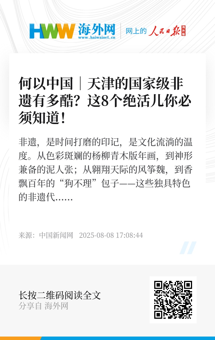 非遗,是时间打磨的印记,是文化流淌的温度。从色彩斑斓的杨柳青木版年画,到神形兼备的泥人张;从翱翔天际的风筝魏,到香飘百年的“狗不理”包子——这些独具特色的非遗代表性项目,既是天津历史的见证,也是城市文化的鲜活名片。跟随海报,一起来看→