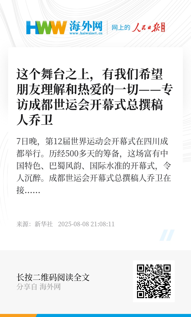 成都世运会开幕式总撰稿人乔卫在接受新华社记者专访时说,开幕式的舞台之上有我们希望朋友理解和热爱的一切。