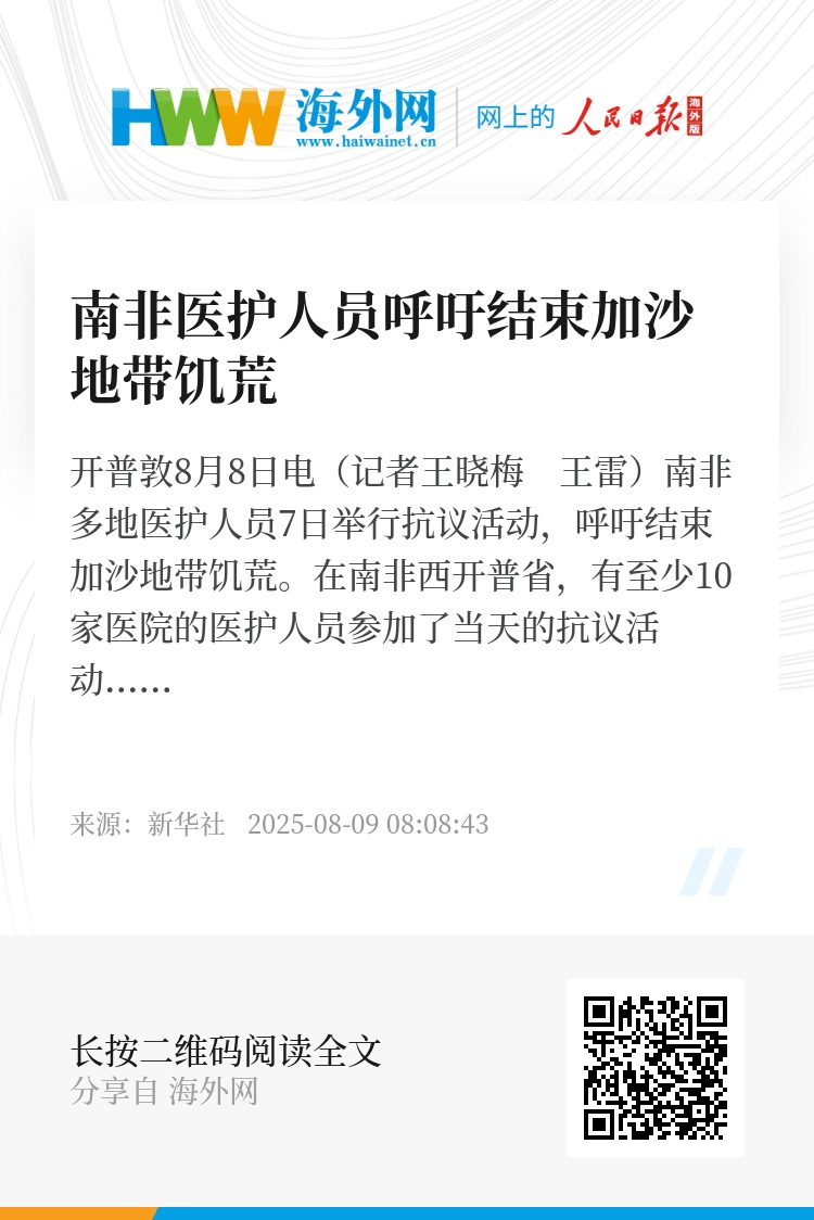 新华社开普敦8月8日电(记者王晓梅 王雷)南非多地医护人员7日举行抗议活动,呼吁结束加沙地带饥荒。