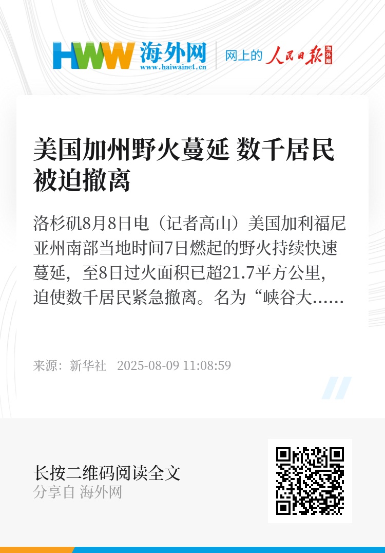 新华社洛杉矶8月8日电(记者高山)美国加利福尼亚州南部当地时间7日燃起的野火持续快速蔓延,至8日过火面积已超21.7平方公里,迫使数千居民紧急撤离。