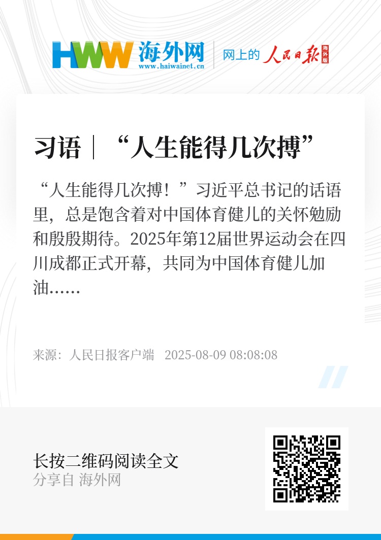 “人生能得几次搏!”习近平总书记的话语里,总是饱含着对中国体育健儿的关怀勉励和殷殷期待。2025年第12届世界运动会在四川成都正式开幕,共同为中国体育健儿加油!
