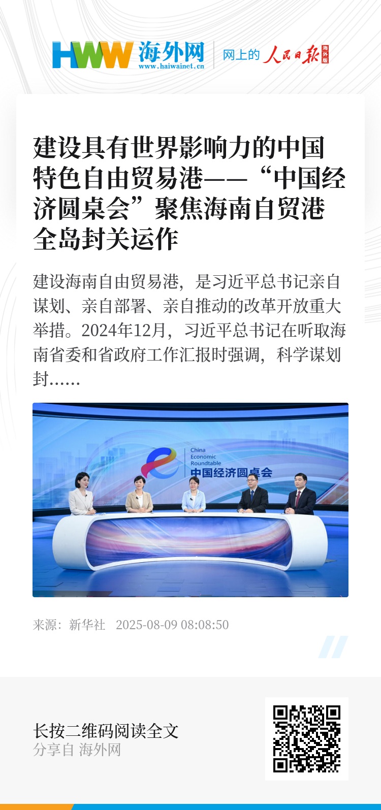 新华社8日推出第二十一期“中国经济圆桌会”大型全媒体访谈节目,邀请国家发展改革委区域协调发展司副司长蔡平、财政部关税司副司长吴京芳、商务部自贸区港建设协调司副司长蒋子军、海关总署自贸区和特殊区域发展司副司长杜朝新,共话海南自由贸易港全岛封关运作。