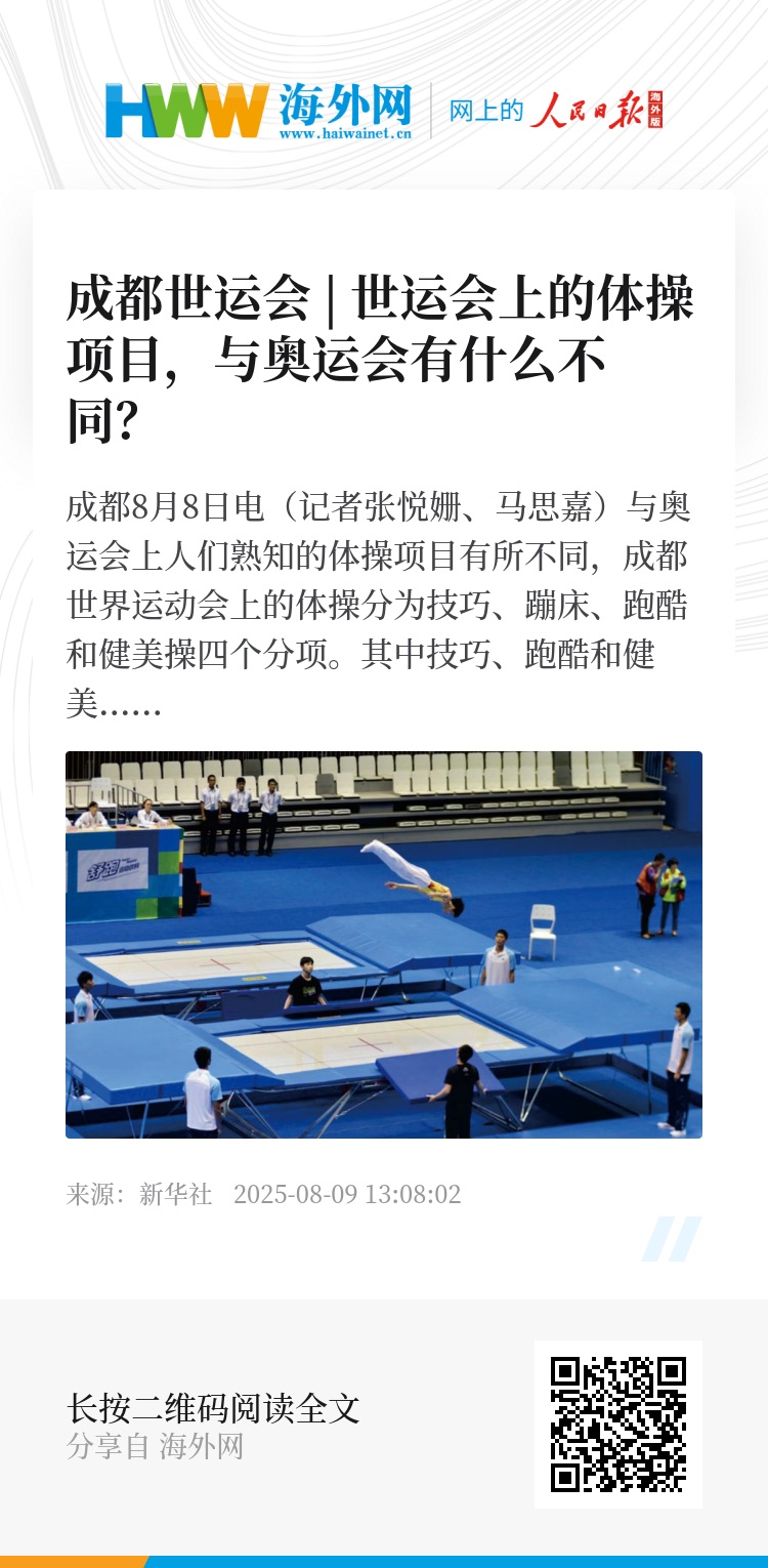 新华社成都8月8日电(记者张悦姗、马思嘉)与奥运会上人们熟知的体操项目有所不同,成都世界运动会上的体操分为技巧、蹦床、跑酷和健美操四个分项。其中技巧、跑酷和健美操虽然都是非奥项目,但与竞技体操、艺术体操、蹦床等同属国际体操联合会大家庭。