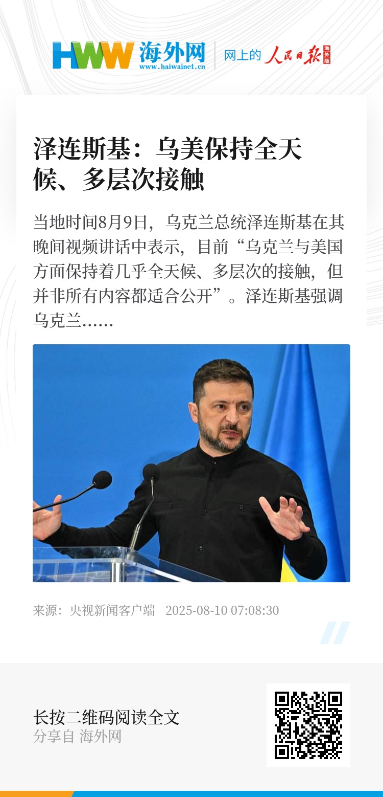 当地时间8月9日,乌克兰总统泽连斯基在其晚间视频讲话中表示,目前“乌克兰与美国方面保持着几乎全天候、多层次的接触,但并非所有内容都适合公开”。