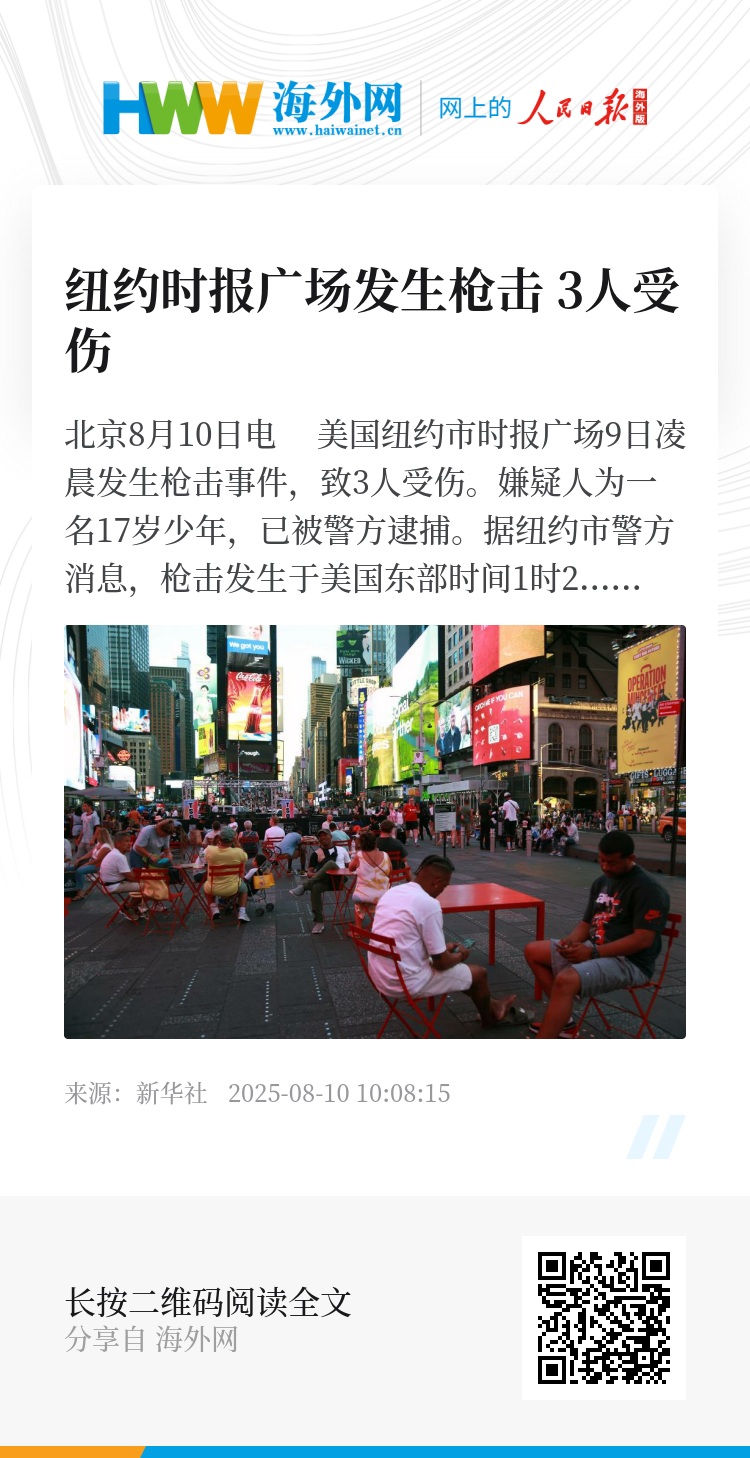 新华社北京8月10日电 美国纽约市时报广场9日凌晨发生枪击事件,致3人受伤。嫌疑人为一名17岁少年,已被警方逮捕。