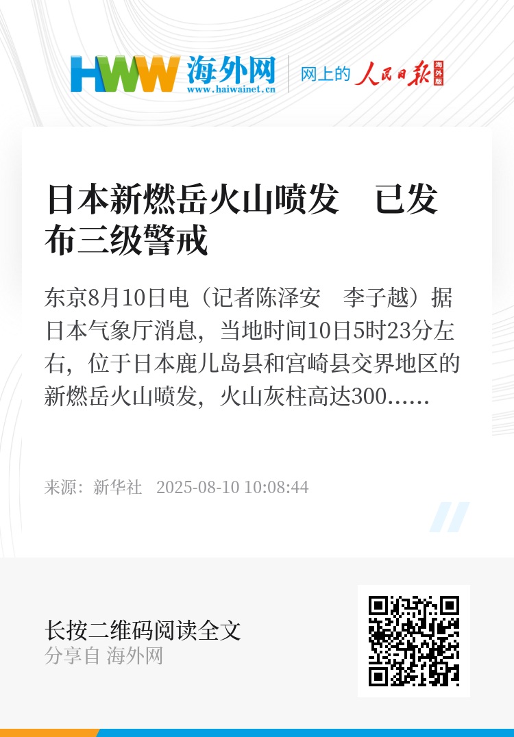 新华社东京8月10日电(记者陈泽安 李子越)据日本气象厅消息,当地时间10日5时23分左右,位于日本鹿儿岛县和宫崎县交界地区的新燃岳火山喷发,火山灰柱高达3000米。日本气象厅已发布新燃岳火山喷发三级警戒,禁止民众进山。