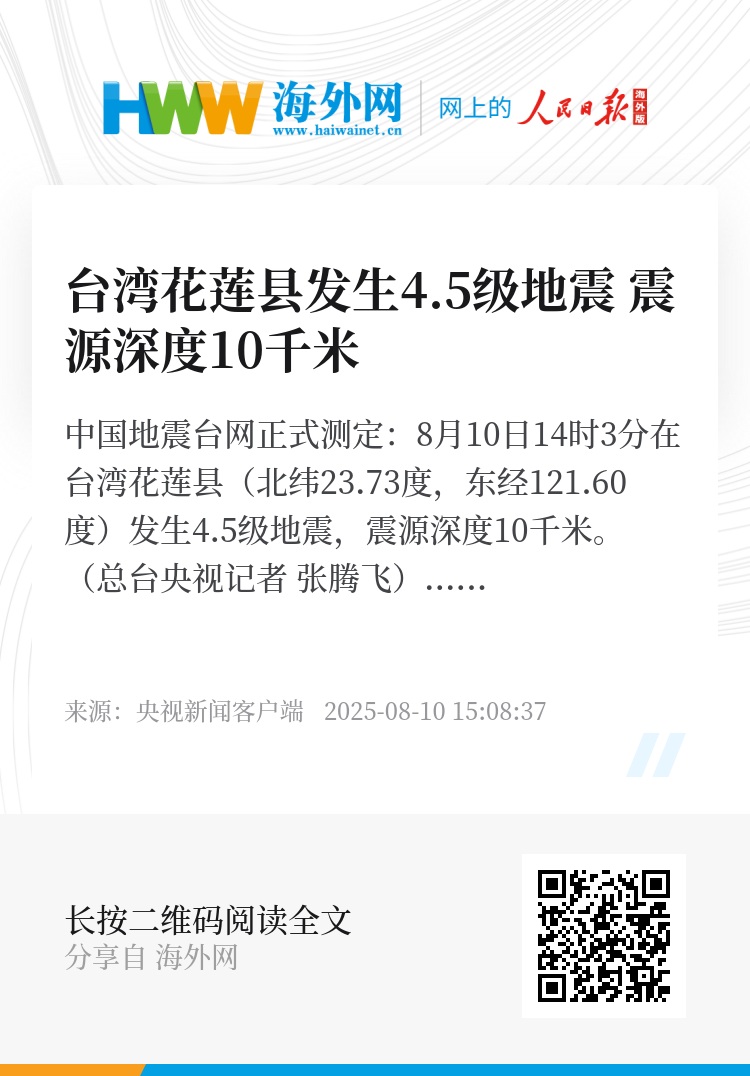 中国地震台网正式测定:8月10日14时3分在台湾花莲县(北纬23.73度,东经121.60度)发生4.5级地震,震源深度10千米。
