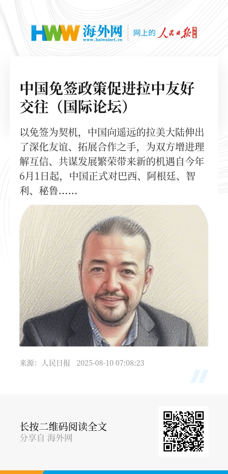 以免签为契机,中国向遥远的拉美大陆伸出了深化友谊、拓展合作之手,为双方增进理解互信、共谋发展繁荣带来新的机遇。随着免签政策的稳步推进、深入实施,拉中之间的经贸往来和人文交流必将更加紧密,合作共赢的故事也将更加生动精彩。我相信,拉中携手,必将为构建更加开放包容的世界贡献更多智慧与力量。